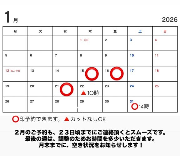 今年もありがとうございました! 未分類 2025.12.282026.01.14 今年も沢山のご縁と、皆様のお力添えのおかげで、無事に一年を過ごすことができました。心より感謝の気持ちです。 ありがとうございました。 新年を穏やかにお迎えください。 1月の空き状況です。 2月以降のご予約も承っております。 大変恐縮ではございますが、1月末より、カット及び部分カットの一部価格変更をさせていただきます。 詳しくはHP、公式LINEのコース料金をご確認ください。 シャンプーコースの変更はございません。 リピート割も引き継続させていただきます。 どうぞよろしくお願い致します。 \ 最新情報をチェック / FacebookXBlueskyHatenaCopy